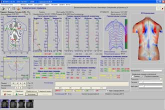 Основная экранная форма пакета WTOPO предназначена для отображения топографических результатов обследования пациента. На форме выводятся графические представления восстановленной поверхности туловища пациента и количественные параметры, описывающие состояние осанки и формы позвоночника в трех плоскостях: фронтальной, сагиттальной и горизонтальной.
