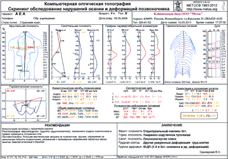 Просмотр топографических результатов обследований пациентов на экране монитора осуществляется в "Основной экранной форме", на которой выводятся графические представления восстановленной поверхности и количественные параметры, описывающие состояние осанки и позвоночника в трех плоскостях: фронтальной, сагиттальной и горизонтальной. Краткое описание параметров - результатов топографического обследования на системе ТОДП - можно посмотреть здесь.